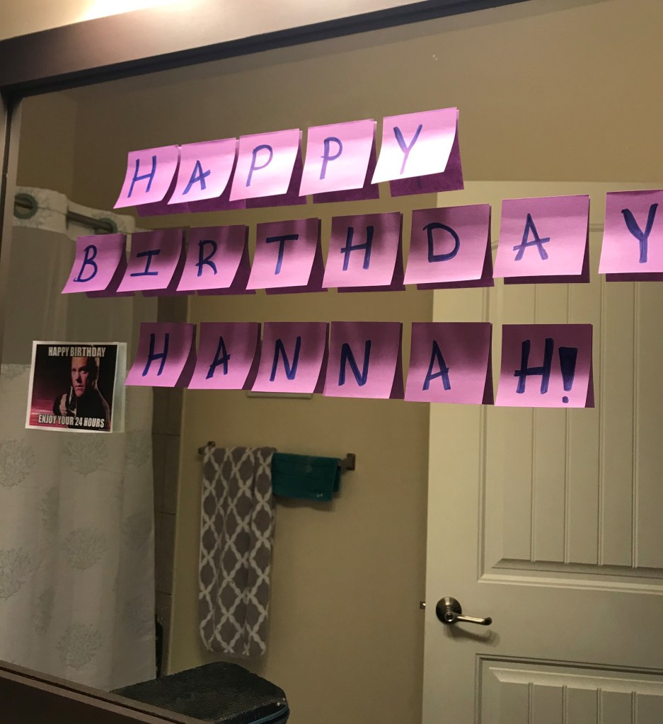 This year, I couldn’t really make plans for my birthday. Surprisingly, I was okay with that. I knew that people cared for me and would make me feel special, and I was not let down. I received countless phone calls, messages, and birthday posts that celebrated me. I woke up to my roommate, Juliet, having decorated the apartment, complete with “24” memes for my “Jack Bauer” year. I had saved the cards and packages that had been coming in the mail to open on my actual birthday, so I enjoyed opening thoughtful gifts and touching messages.